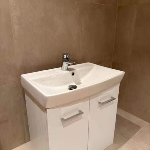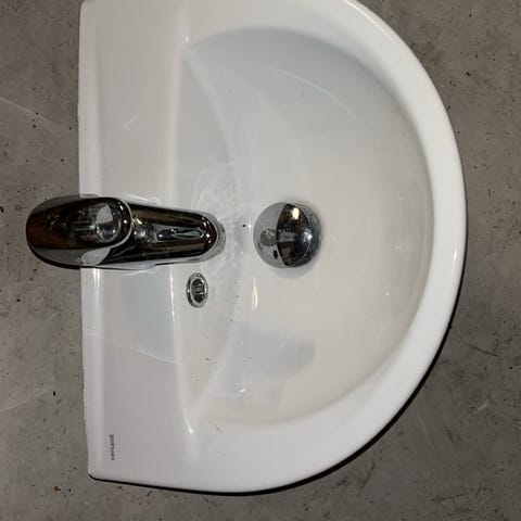 Vasken er kun 50 cm bred og bygger ca 38 cm ut fra veggen. Blandebatteri følger med. Det er også en propp til vasken.