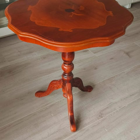Lite bord i rokokostil med mange bruksområder, eksempelvis sidebord, lampebord, pyntebord, nattbord, kaffebord etc. Fint, bortsett fra et stort merke/flekk på overflaten, så trenger litt kjærlighet/behandling, eventuelt en duk. Må hentes.