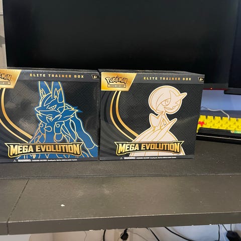 Pokémon Mega Evolution Elite Trainer Box med innhold som hjelper til i Pokémon-kortspill. Produktet inkluderer samlekort og tilbehør for spillere.