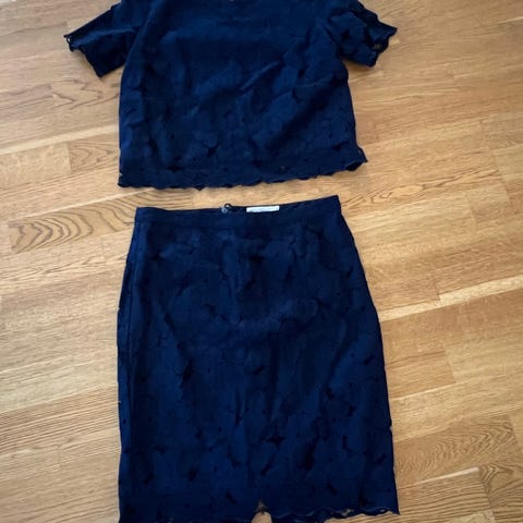 Både kjolen og kåpen er knekorte, har kinakrage, brokademønster og er helt kullsort i fargen. Stoffet er mest sannsynlig acetatbrokade, altså kunstig. Settet er nesten perfekt, eneste synlige slitasje er bittelitt på hekten i nakken.