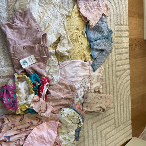 barneklær for jente i størrelse 74, farge rosa. Inneholder ulike plagg som bodyer, bukser, kjoler og gensere.