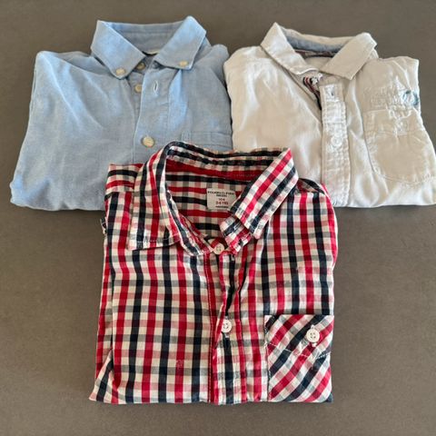 Skjorter fra Reflex og Holly & Whyte i str 122/128, tynn joggedress fra gullkorn str 122 ( synlig brukt-noe nuppete) og newbie bukse str 122 (synlig brukt)