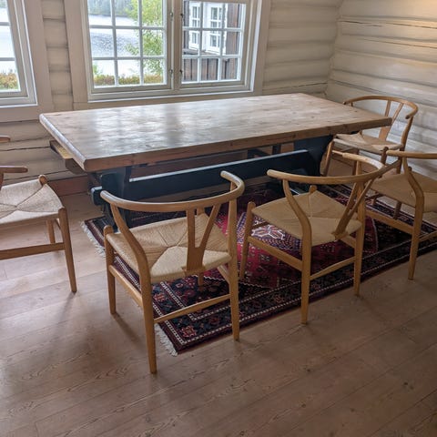 Pent brukt spisebord med innleggsplater + 8 stoler selges etter filmproduksjon. Ledig fra den 12.mars. Må hentes i Oslo.