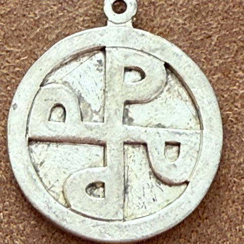 Halskjedet består av vokset snor og bronsefargede metalldeler (metalllegering).