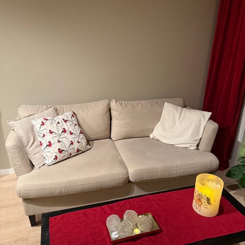 Komfortabel sofa i beige fargen i god stand.