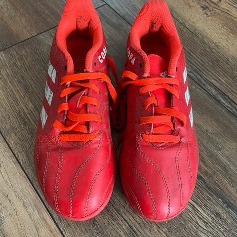 Adidas Sala fotballsko i fargene hvit, oransje og blå. Str 35. Passer for innendørs bruk.