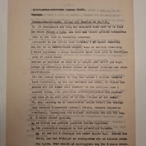 Brevet er skrevet på Rikspropgandaledelsen (kontoret i Vest-Viken) sitt brevpapir, og er sendt til lagspropagandaledelsen Drammen fra fylkespropagandafører Bjarne Steff (med signatur).