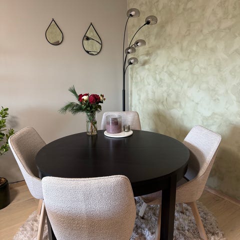 Rundt spisebord i tre fra IKEA. Kan kjøpes med 6 stoler (av den typen man ser på bildene hvis ønskelig). Må hentes med avtalt hentetid (Malerhaugveien 36)