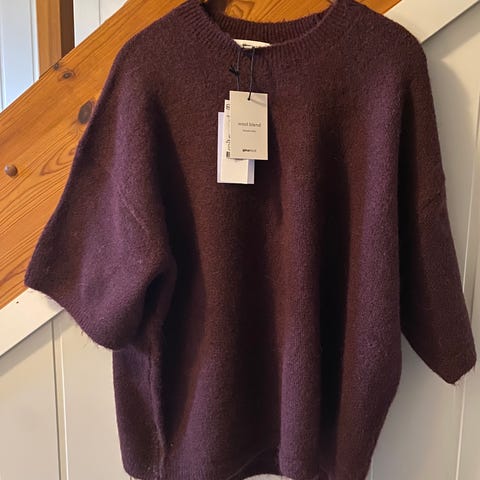 Genseren har kortere ermer og er i en flott rødfarge med hvite/offwhite striper. Består av 95% bomull og 5% elastan. Det er en veldig liten flekk øverst i halsen, mulig den går av i vask. Genseren har merkelappen på og har kun hengt i skapet.