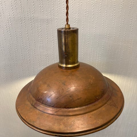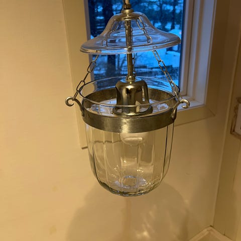 Gammel taklampe med gul-hvitt glass.