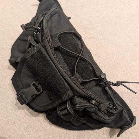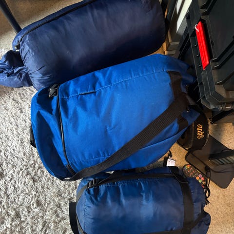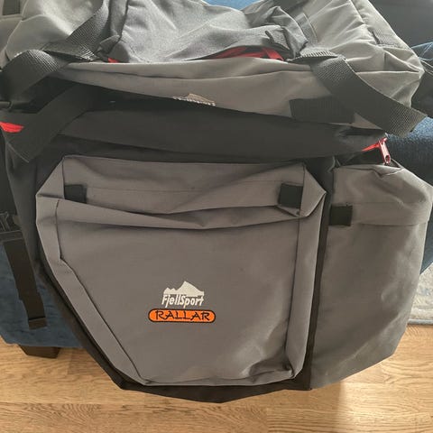 Svarte vesker. Brukt på en tur. Midterste veske kan tas av og brukes som sekk.