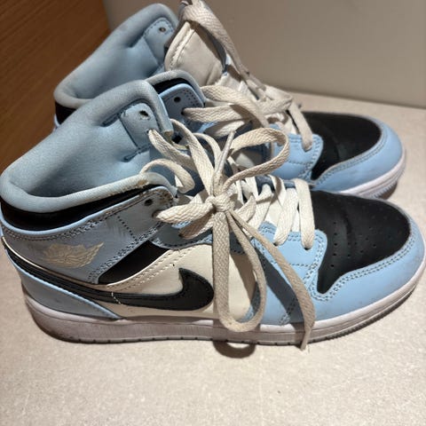 Nike Air Jordan barnesko i svart og hvit farge. Passer for gutter. Størrelse er ikke spesifisert. Skoene har høyt skaft og klassisk design med laces.