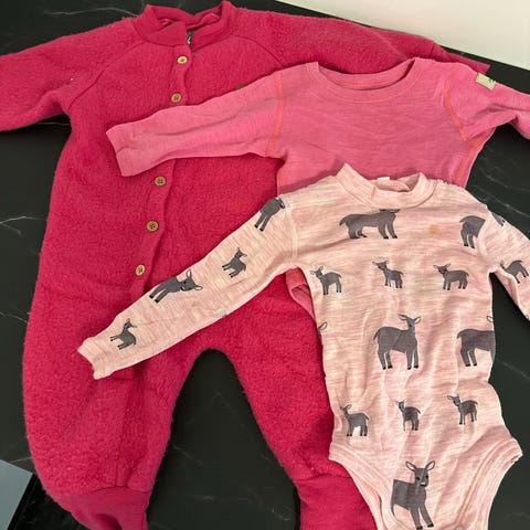 Ullpakke str 68/74. Undress hummel 74 og ullpysj hust&claire 74, rosa ullbukse 68/74 og rosa/hvit ullbody 68/74.