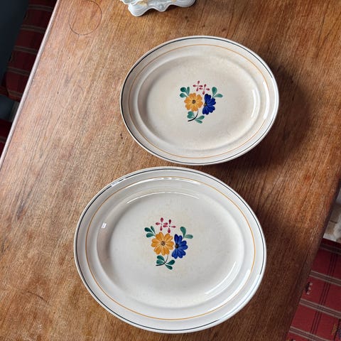 Pent vintage serveringsfat fra Egersund Fayancefabrikk, produsert i Norge. Klassisk blå/hvit dekor med blomster og fuglemotiv. Stemplet Egersund Norway på undersiden.