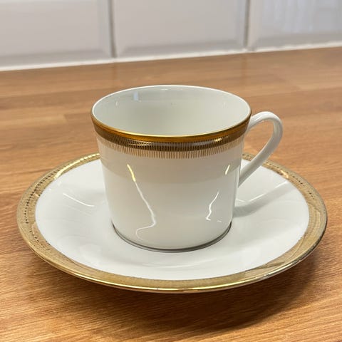 6 kaffekopper med skål og detaljer i gullkant. Produktet består av porselen og har et klassisk design. Ingen hakk/skader, og gullkantet er intakt.