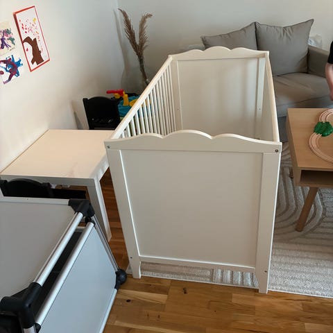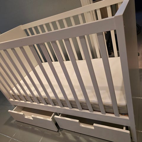 IKEA Sprinkelseng i hvit farge. Sengen har et enkelt design med sprinkelrammer som gir god ventilasjon og sikkerhet for barnet. Egnet for bruk som barneseng i hjemmet.