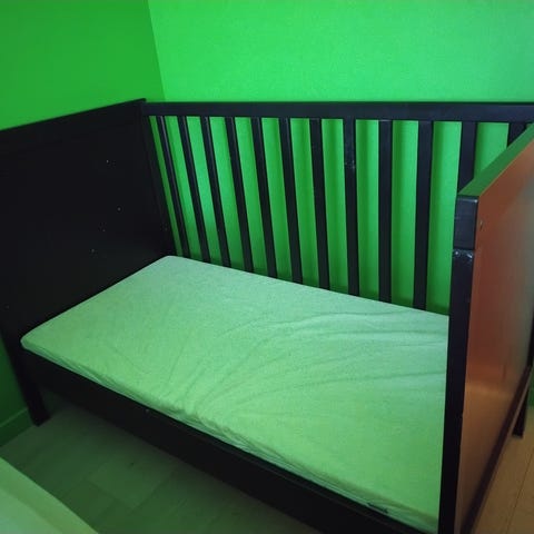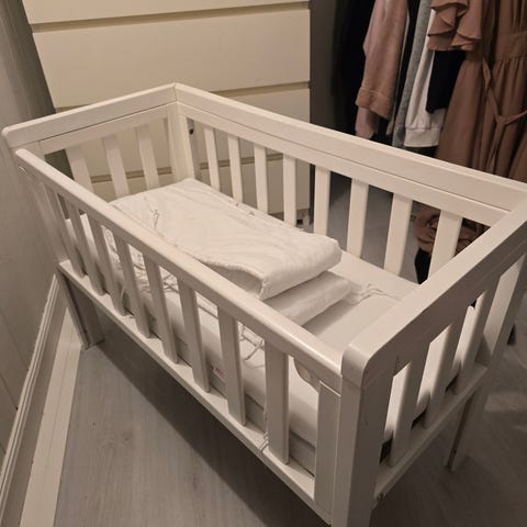 Følger med to madrasser, trekk på madrass, tisselaken og ekstra laken.