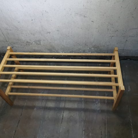 3 skråskjærte hyller i eik selges. Hyllene er 82 cm lang, der den en enden har en bredde på 38cm og den andre enden har en bredde på 55cm. Garderobestang på 82 cm kan også medfølges om ønskelig. Må hentes på Fagerborg.