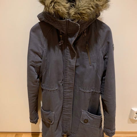 Fin vattert parkas/ kåpe i svart. Innsvinga i fasongen, med hette og gode lommer.