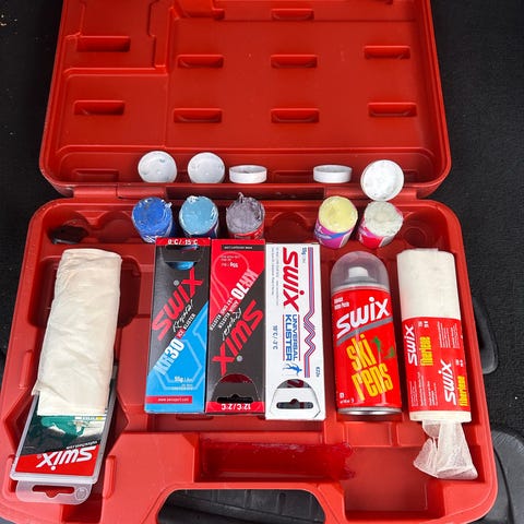 Gammel Swix smørekoffert som inneholder ulike skismørninger, klister, rensemiddel og glider. Klisteret og glideren er uåpnet. Skismørning er åpnet, men lite brukt.
