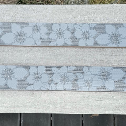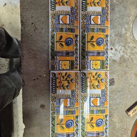 Flisene måler 45*45 cm og danner et flott sirkelformet mønster. Ble dessverre ikke brukt her hos oss.