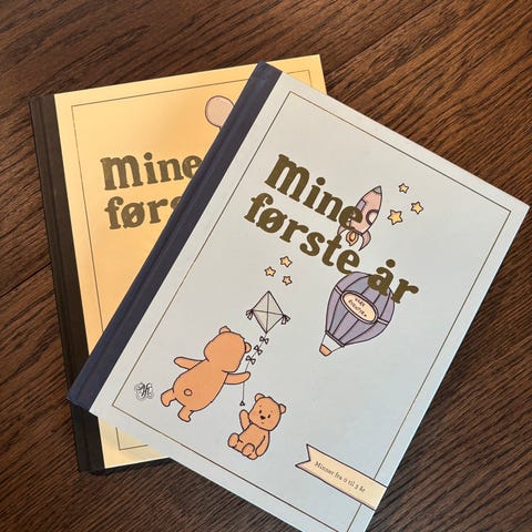 Mine første år minnebok i grønn farge. Boken er designet for å dokumentere og bevare minner fra barnets første år. Fikk to like og har glemt å bruke byttelappen, boken er derfor helt ny og ubrukt. Nypris fra 319,—399.