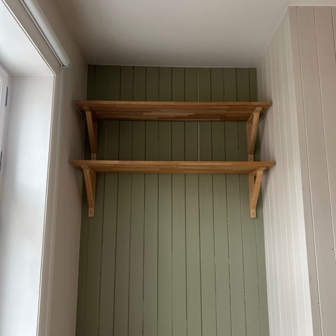 2 hyller av eik selges. 30 cm bred og 130 cm lang. Må hentes på Fagerborg.