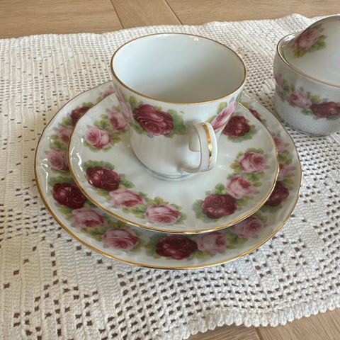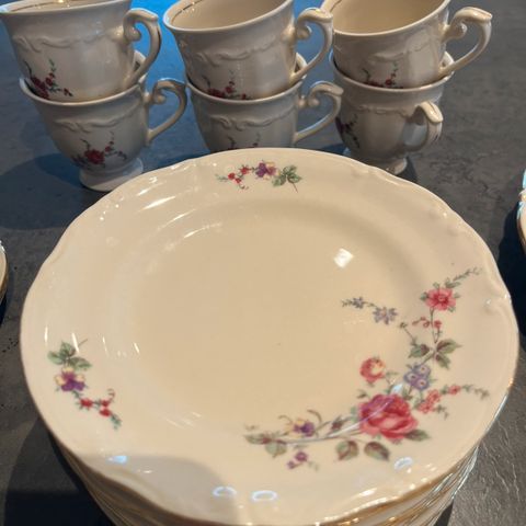 17 asjetter, 11 tefat, 9 kaffekopper, 1 sukkerskål med lokk og 1 fløtemugge med lokk
