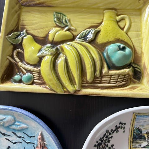 Keramisk veggdekorasjon fra Italy formet som en kvinne med hatt og forkle. Dekorasjonen har farger som rød, hvit og gul, og viser detaljer som kjøkkenredskaper på forkleet. Egnet til dekorasjon av kjøkken eller spisestue.