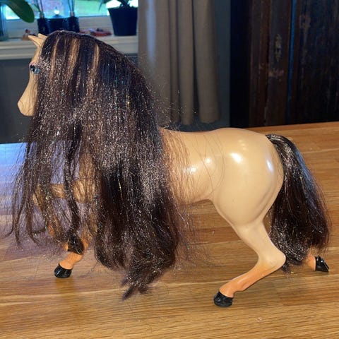 Den hvite lekehesten med det rosa teppet er sannsynligvis en Barbie hest. Fra sent 80 tall. Muligens tidlig 90 tall.