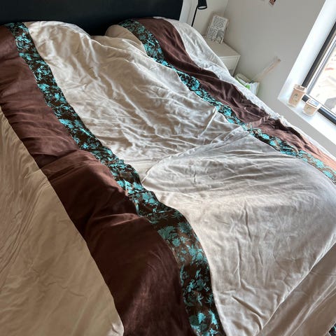 Sengeteppe i bruntoner selges