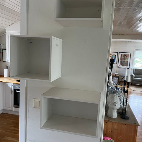 5 små hyller av eik selges. Størrelse 43,5 x 37,5 og 4 høy. Hylleknektene medfølger ikke. Må hentes på Fagerborg.