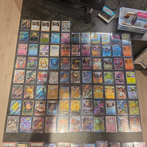 Samling av Pokémon og One Piece samlekort i plastlommer. Kortene er i god stand og oppbevares i en perm med plastlommer for beskyttelse.