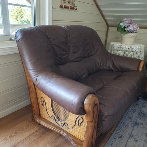 Skinnsofa 3+2 med bord selges mørk rød/brun