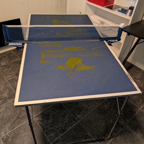 Det følger med bordtennisnett, racketer og baller, så dette er et komplett sett klart til bruk. Riktignok er flere av racketene gamle og har slitasje skader.