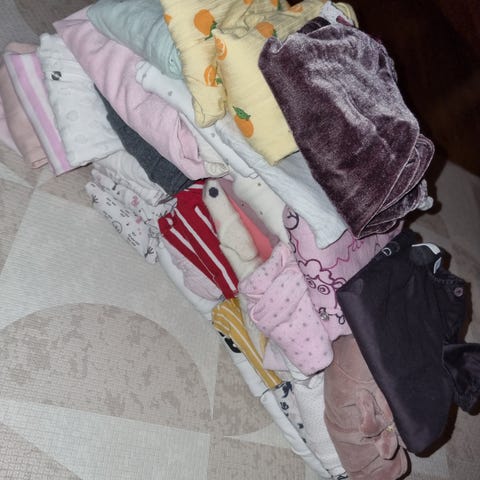 Stor klespakke med klær i størrelse 50, 56 og 62. Noen plagg er brukt av 1 barn, noen av 2 barn og noen plagg er kun vasket. God stand. Body, bukse, longs, genser, ulldress x2 (tynn og tykk), kjoler og pysj.