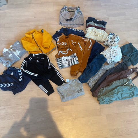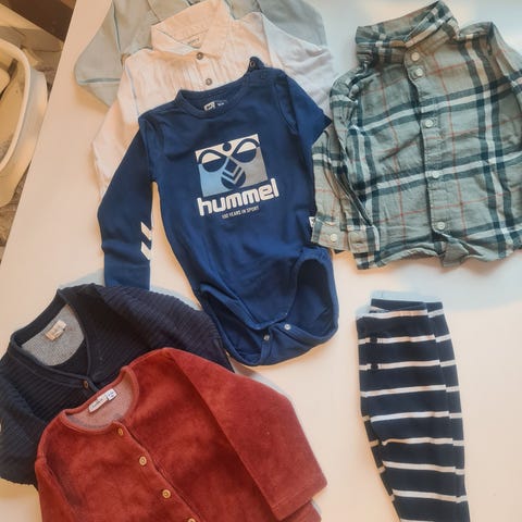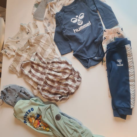 Hummel barneklær pakke/klespakke i størrelse 80, flerfarget og unisex. Inneholder flere plagg inkludert en denim overall, en oransje body, en grønn jakke med hvite detaljer på ermene med matchende bukse og en blå jakke. Plaggene er laget for barn og passer til både gutter og jenter.