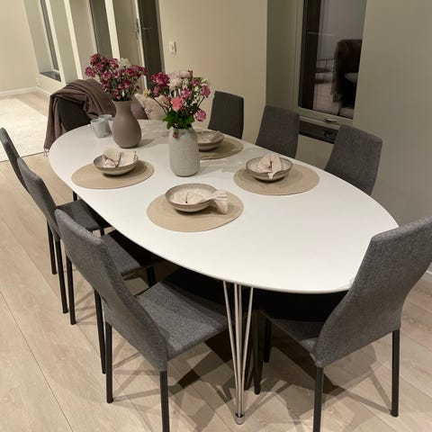 I Bord og stoler er i god stand. Det er normale bruksspor, blant annet en liten slitasje på én stol (se bilde), men ingenting som påvirker funksjon.