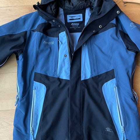 Bergans vinterjakke i størrelse L, laget med Gore-Tex materiale. Jakken har blå farge og er designet for utendørs bruk i kalde værforhold.
