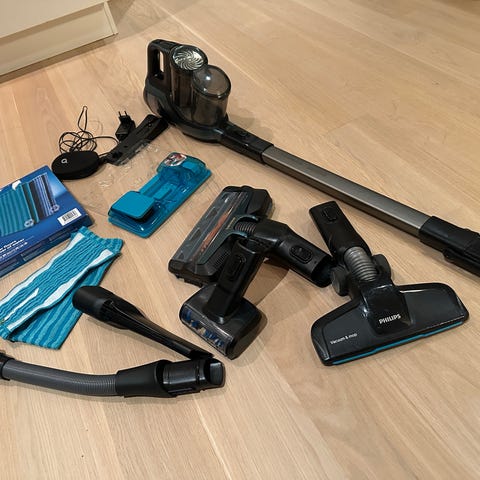 Støvsugeren er batteridrevet, lett i vekt og praktisk til daglig rengjøring av gulv, tepper og små områder.