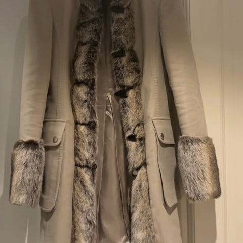 Rutete kåpe i.hvitt og svart. 80% ull, 20 polyester. Herlig kvalitet og svært pent brukt. Det er bra lengde på ermene, splitt bak og kun belte til lukning
