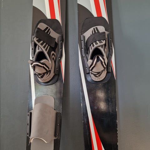 O'Brien Vannski med bindinger. Passer for bruk på vannflater. Farge i rødt, hvitt og gult. Designet for vannskiaktiviteter.