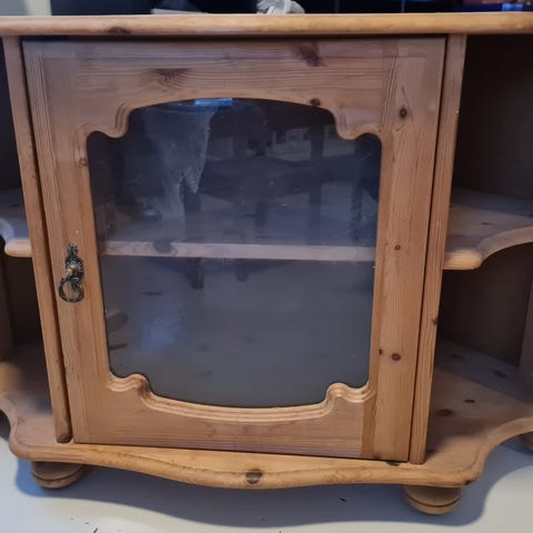 Gammel tv benk i furu som er beiset, hel og mye bruk igjen. Står på vennerød i Stokke.