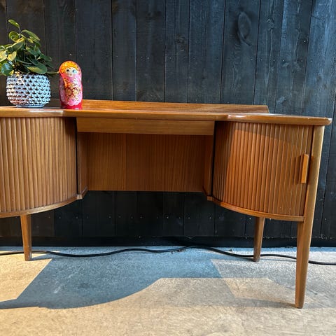 Et skikkelig lekkert teak møbel med sjalusidører. Dette er opprinnelig et sminkebord og speil følger med, men jeg har brukt det som en skjenk / konsollbord. Fungerer også som skrivepult.