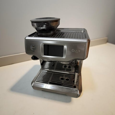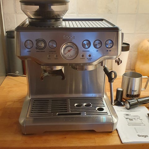 Sage The Barista Pro espressomaskin med integrert melkeskummer. Maskinen har en digital skjerm og flere kontrollknapper for justering av innstillinger. Leveres med tilbehør som melkekanne, filterholdere og brukermanual.