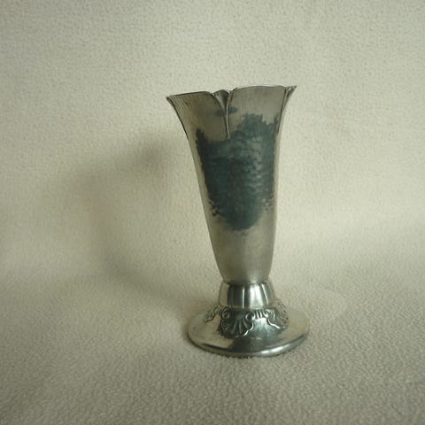 Dette er en sølvplettet stengelvase i modernistisk stil, ofte tilskrevet Astri Holthe.