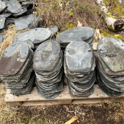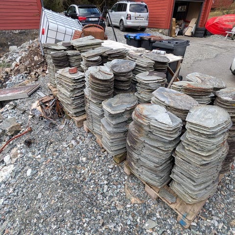 Fasadeskifer 20 * 60 cm. Har 20 stk - ca 2,5 kvm. Flotte til f.eks et blomsterbed eller som blikkfang ute eller inne.