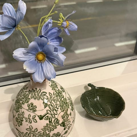 En gammel fargerik lysholder i glass. Foruten noen bobler i glasset, så er den i pen stand.