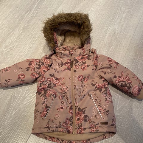 Newbie jakke i størrelse 86 for jenter. Jakken er rosa med blomsterprint og laget av polyester. Den har hette med fuskepels og er egnet for barn i alderen 12-18 måneder.