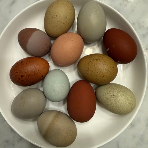 Hønene våre legger egg i fargene lys brun, mørk brun,flekkete brun, turkis og grønn. De legger stort sett 1 egg om dagen, sett bort i fra eggpauser på vinteren og ved myting.
